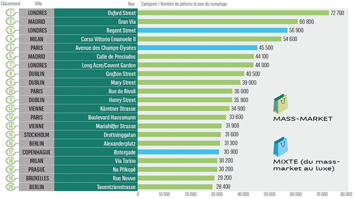 Oxford Street, en Londres, sigue siendo la calle más popular y más transitada por el mercado comercial con 72.700 visitantes al día. Los datos han sido recabados por un estudio realizado por BNP Paribas Real Estate y Locatus. En el mismo se ha medido el atractivo de las calles comerciales europeas y se ha tenido en cuenta el flujo peatonal (las más visitadas) en las mejores 34 ciudades.