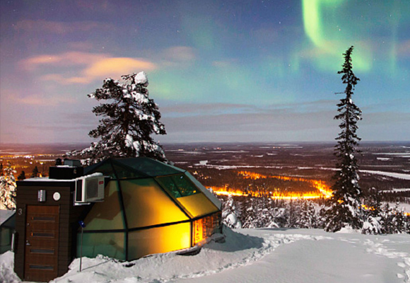 Uno de los hoteles más populares en el Círculo Polar Ártico es Kakslauttanen Arctic Resort en la estación de esquí de Saariselka, a 30 km del aeropuerto de Ivalo (Finlandia). También cuenta con iglús de cristal donde se pueden contemplar las auroras sin moverse de la cama y cabañas con sauna y chimenea.