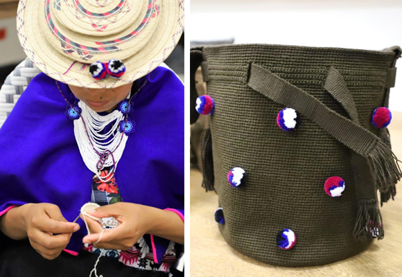 Compartí varias jornadas con mujeres de la región del Cauca, en concreto de la comunidad Misak. Ataviadas con sus trajes y sombreros típicos, como el bellísimo “tampalkuarí”, mostraban al público la forma en la que tejen las mochilas “urasr” con lana de sus propias ovejas, que primero esquilan, después lavan, secan, peinan, hilan y por supuesto tintan ellas mismas para tejer luego los bolsos con pompones.