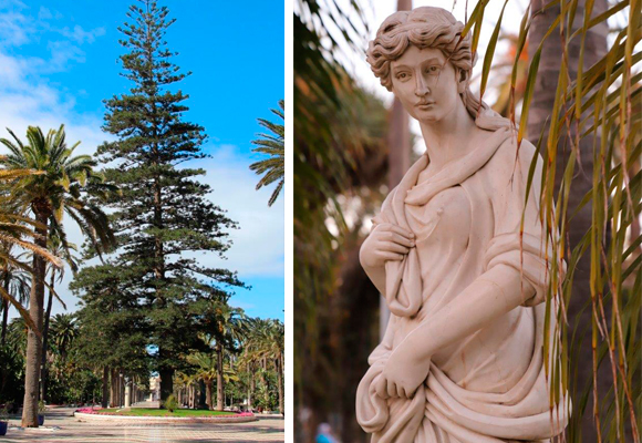 Con una magistral visión de futuro, los jardineros encargados diseñaron un jardín que a la larga resultó perfecto. Las pequeñas palmeras (canarias, datilera y Washingtonia) que entonces se plantaron se han convertido en esbeltas señoritas, altas y delgadas, que vigilan desde las alturas para que el paso del tiempo no deteriore su parque.