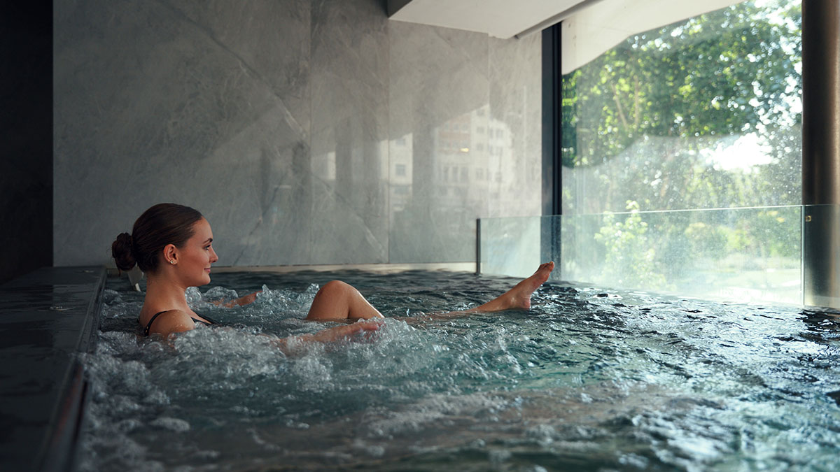 La siguiente parada es el spa. Se ubica a unos metros de la zona de desayuno y nada más entrar te sumerges en un ambiente de paz y desconexión. En el circuito de aguas la gran protagonista es una piscina de borde infinito que se ubica frente a una cristalera con vistas a Madrid. Así, mientras estás a remojo y disfrutando del jacuzzi puedes ver el ritmo frenético de la ciudad. Pero tú te olvidas de todo.