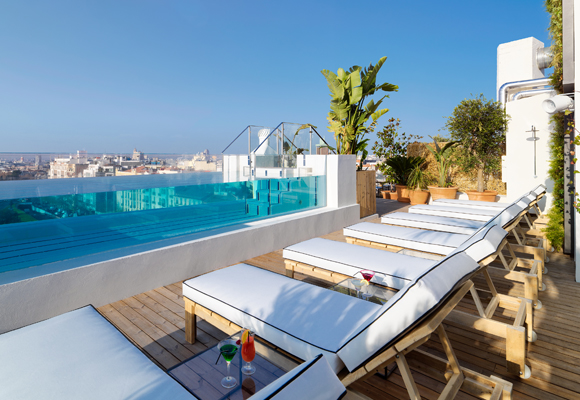 Y si hablamos de lugares castizos, ninguno como el Hotel Emperador en plena Gran Vía madrileña. Sus más de 800 m2 de terraza, piscina, solárium, camas balinesas, zona chill out, restaurante snack-bar y la coctelería del bartender Luca Anastasio hacen de este espacio un oasis en mitad del asfalto de la capital con espléndidas vistas sobre el Palacio Real, la Almudena y la Casa de Campo. El espacio, renovado el año pasado, amplía su horario este verano hasta las 2.00 horas y también mantiene abierta la piscina para personas no alojadas en el hotel por el precio diario de 46 euros con acceso también al Beach Club. Su reciente acuerdo con Möet & Chandon Ice Impérial hará que sus ciclos veraniegos Emperador Sunset adquieran otra dimensión más exclusiva, si cabe.