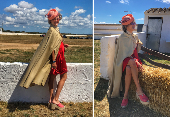 El código de vestimenta era acudir elegante y con sombrero, pamela o tocado. Así que opté por un vestido de seda con pechera en organza de Josep Font, probablemente del siglo pasado, pero de diseño atemporal. Los tonos me parecieron muy acertados con la isla de Menorca, las amapolas de su primavera y el dorado de sus playas. Para combatir el viento, el día era soleado pero ventoso, me decidí por una capa de Juan Duyos, también del siglo pasado. Así que para dar el toque de actualidad me decanté por unas sandalias de la firma riojana Las Pacas y un sombrero casquete de Montesinos Vilar Sombrerería.