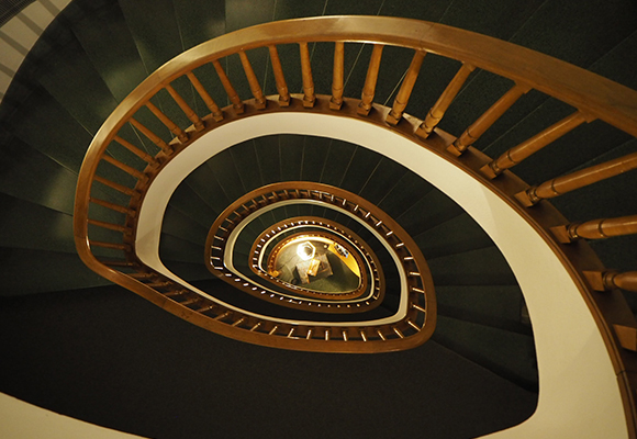 Siguiendo con la línea disonante de sus habitaciones, los espacios comunes no están en la planta baja sino en el primer piso del edificio. Una de las estancias más llamativas es la biblioteca, donde no solo podemos encontrar libros con información sobre Barcelona y novelas en varios idiomas y de todos los géneros, sino también productos alimenticios a disposición de los huéspedes durante las 24h del día.